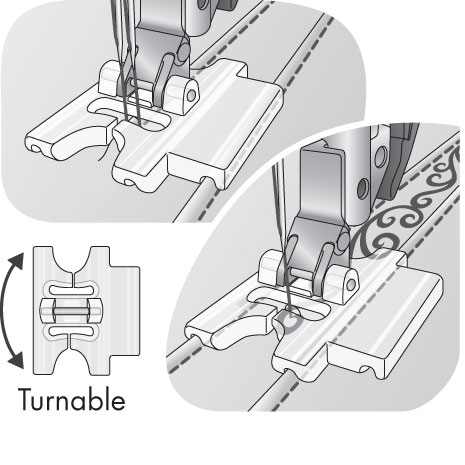 Mit diesem Nähfuß können Sie exakte Biesen mit einem Abstand von 5 bis 11 mm nähen. Mit demselben Nähfuß nähen Sie in die Zwischenräume Zierstiche mit einer Breite von bis zu 6 oder 9 mm.