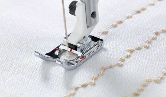 Nähen Sie mit Candlewicking-Techniken wunderschöne Nostalgiestiche! Der Candlewickingfuß hat eine tiefe Rille an der Unterseite, um besser über voluminöse Stiche gleiten zu können.