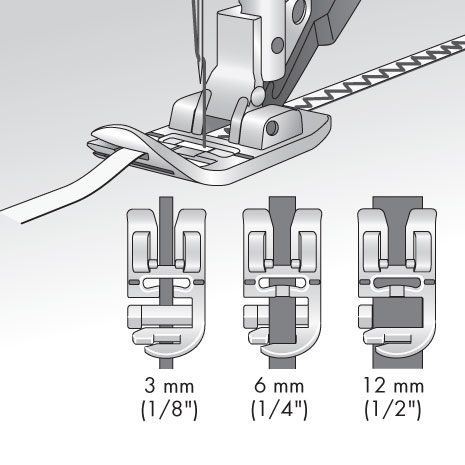 Mit dem dekorativen Zierbandfuß verschönern Sie Ihr Projekt mit verschiedenen Besätzen. Dieser Fuß führt den Besatz spielend durch die vordere Öffnung und durch die Rille auf der Unterseite.