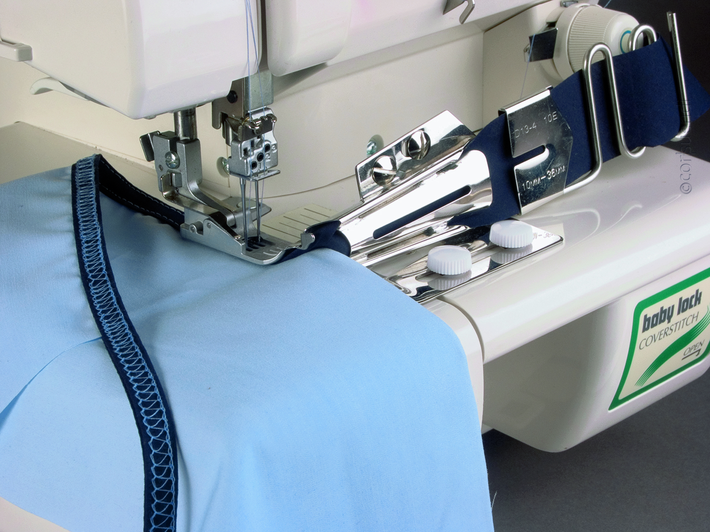 Der Doppelfaltschrägbinder macht es möglich, Stoffkanten oder Halsausschnitte mit Cover- oder Doppelkettstich sehr schnell und sehr exakt mit Schrägband einzufassen, wobei die Ober- und Unterseite des Schrägbandes doppelt umgeschlagen werden. Mit Hilfe des Führungsrechen wird das Schrägband perfekt und einfach in den Doppelfaltschrägbinder geführt.