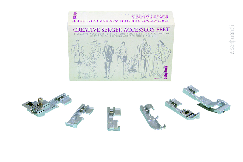 Nutzen Sie die Möglichkeit zur Verarbeitung diverser Accessoires mit folgenden nützlichen Nähfüßen: - Perlenfuß - Paspelfuß 3 mm u. 5 mm - Blindsaum - Kräuselfuß - Gummiband