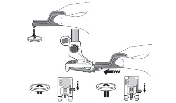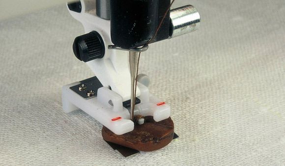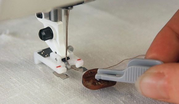 Dieser Knopflochfuß näht Knöpfe mit Stiel, d. h. etwas Abstand zum Stoff an, damit sie sich leichter knöpfen lassen.