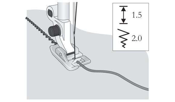 Zum Annähen von Soutache, Kordeln und schmalen Bändern als Verzierung an Bekleidung und Heimtextilien. Zickzackstich, Stichlänge 1,5 und Stichbreite entsprechend der Kordel- bzw. Bandbreite einstellen. Den Kordelfuß anstecken.