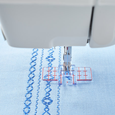 Der Mehrfachlinien-Zierstichfuß hilft Ihnen speziell beim Gestalten paralleler Zierstichreihen mit gleichmäßigem Abstand. Dadurch, dass der Fuß durchsichtig ist, können Sie die Stichreihen ganz leicht parallel ausrichten. Um die Reihen mit gleichmäßigem Abstand anzuordnen, orientieren Sie sich einfach an den vertikalen Führungslinien. Die horizontalen Führungslinien dienen dazu, Startpunkte exakt zu positionieren und an Ecken akkurat zu wenden – mit einem Abstand von ¼” (6 mm) bzw. ½“ (12 mm). Der Mehrfachlinien-Zierstichfuß kann auch zur Orientierung beim Nähen von Maxi-Stichen eingesetzt werden.
