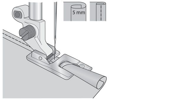 Für einen schmalen Saum auf z.B. Baumwollstoffen, geeignet für Serviettenkanten, Vorhänge und Rüschen. Geradstich mit Stichlänge 2,5 bis 3 einstellen (auch für Zierstiche geeignet). Säumerfuß einsetzen. Für einen schmalen Saum in sehr leichten Stoffen wie z. B. Seidenschals, Batist-Servietten, Hemden, Rüschen und Unterwäsche. Geradstich mit Stichlänge 2.