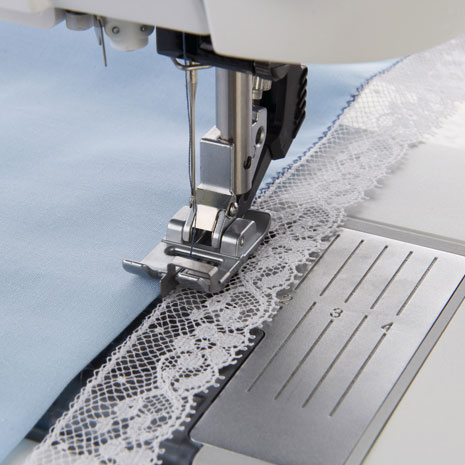 Der Schmalkantenfuß eignet sich perfekt zum präzisen Absteppen und zum Verbinden von Spitzen und/oder Stoffkanten (z. B. zum Befestigen von Spitze an einer fertigen Stoffkante).Die Metallführung in der Mitte des Fußes sorgt dafür, dass der Abstand zwischen den beiden Stoffen eingehalten wird.