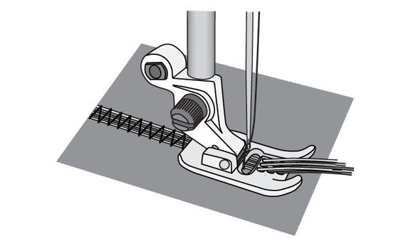 Zum Anfertigen und Aufnähen von eigenen Zierbändern in einem Arbeitsgang. Schnelles Verzieren mit bis zu sieben dekorativen Fäden gleichzeitig. Mit einem Zierstich oder Zickzackstich nähen, die Stichbreite der Anzahl der Fäden anpassen. Nach Bedarf Vlies unterlegen.