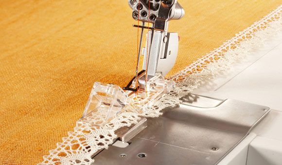 Mit dem Spitzen- und Bortenfuß können Sie einfach Spitzen und Borten mit einem Coverstich an Stoffe annähen und so wunderschöne dekorative Kanten und Effekte erzeugen.