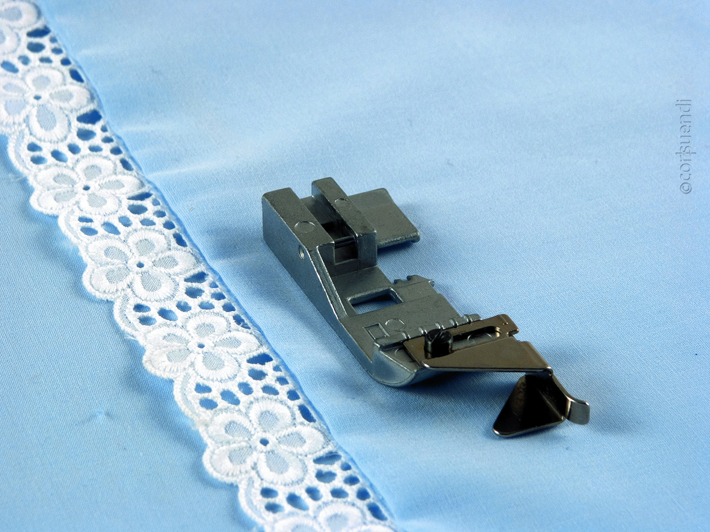 Dieser Fuß ist die perfekte Lösung, um Spitzen und Borten einfach auf die Stoffoberseite aufzunähen.