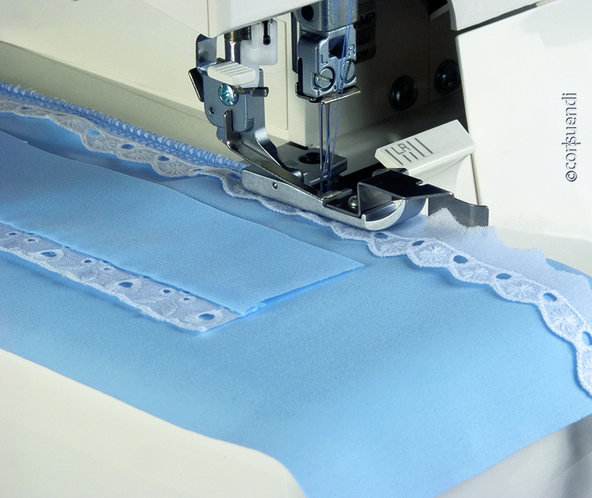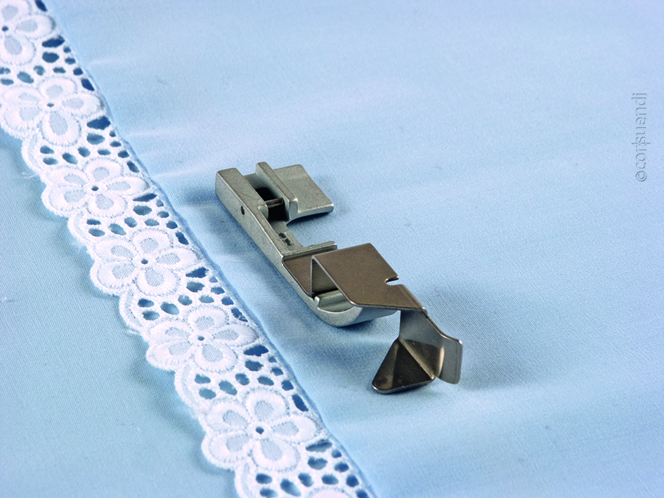Dieser Fuß ist die perfekte Lösung, um Spitzen und Borten einfach auf die Stoffoberseite aufzunähen.